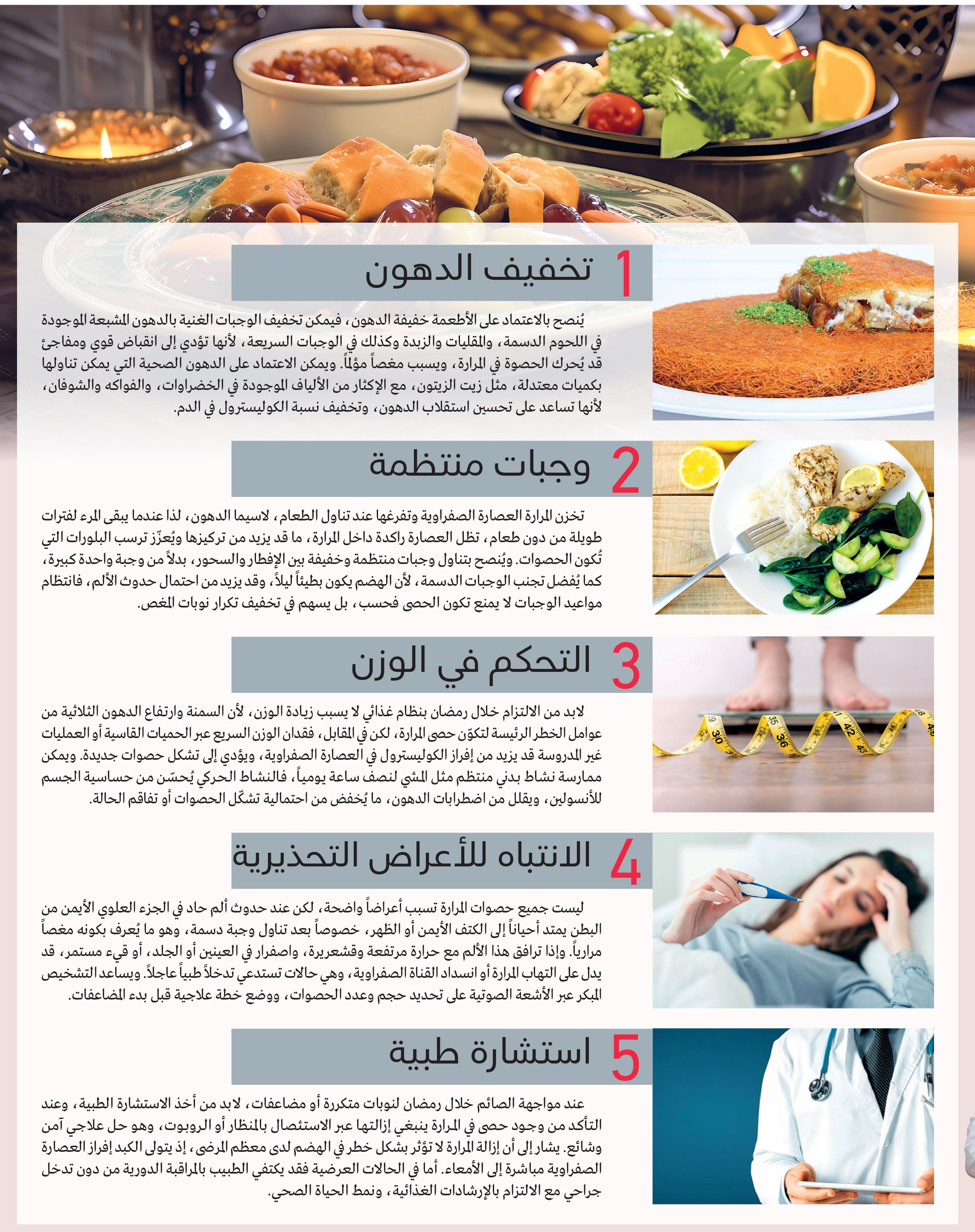يساعد تقسيم الطعام بين الإفطار والسحور إلى وجبات صغيرة ومتوازنة على تقليل الضغط على المرارة وتحسين عملية الهضم.