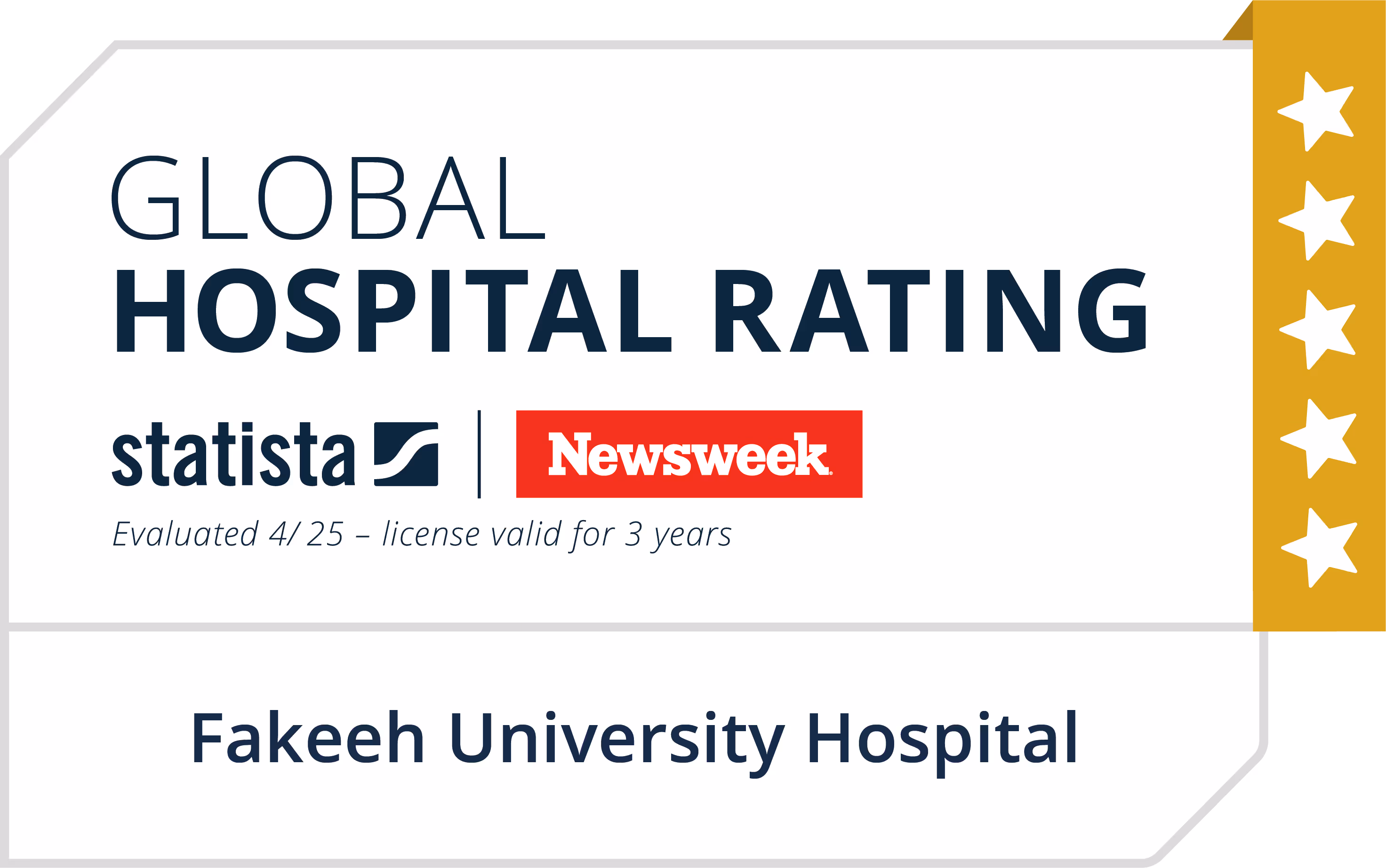 Fakeeh University Hospital is proud to announce that it has received a prestigious 5-star rating from the Global Hospital Rating, conducted by Newsweek in collaboration with Statista. This global recognition places us among the top healthcare institutions worldwide, reaffirming our commitment to excellence in patient care and innovation.